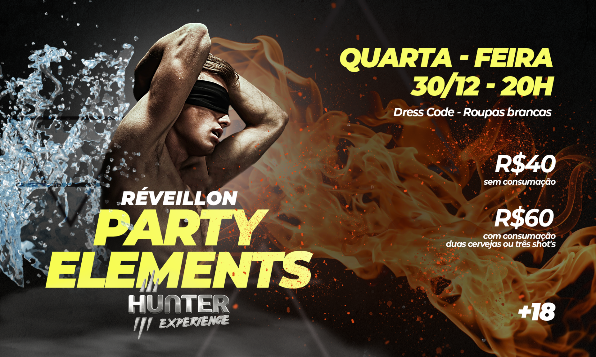 PARTY ELEMENTS é o Réveillon da Hunter. Prepare a roupa branca e fique à vontade para tirar quando chegar aqui porque o clima estará quente. A casa tem guarda-volumes (lockes) disponíveis para os clientes.